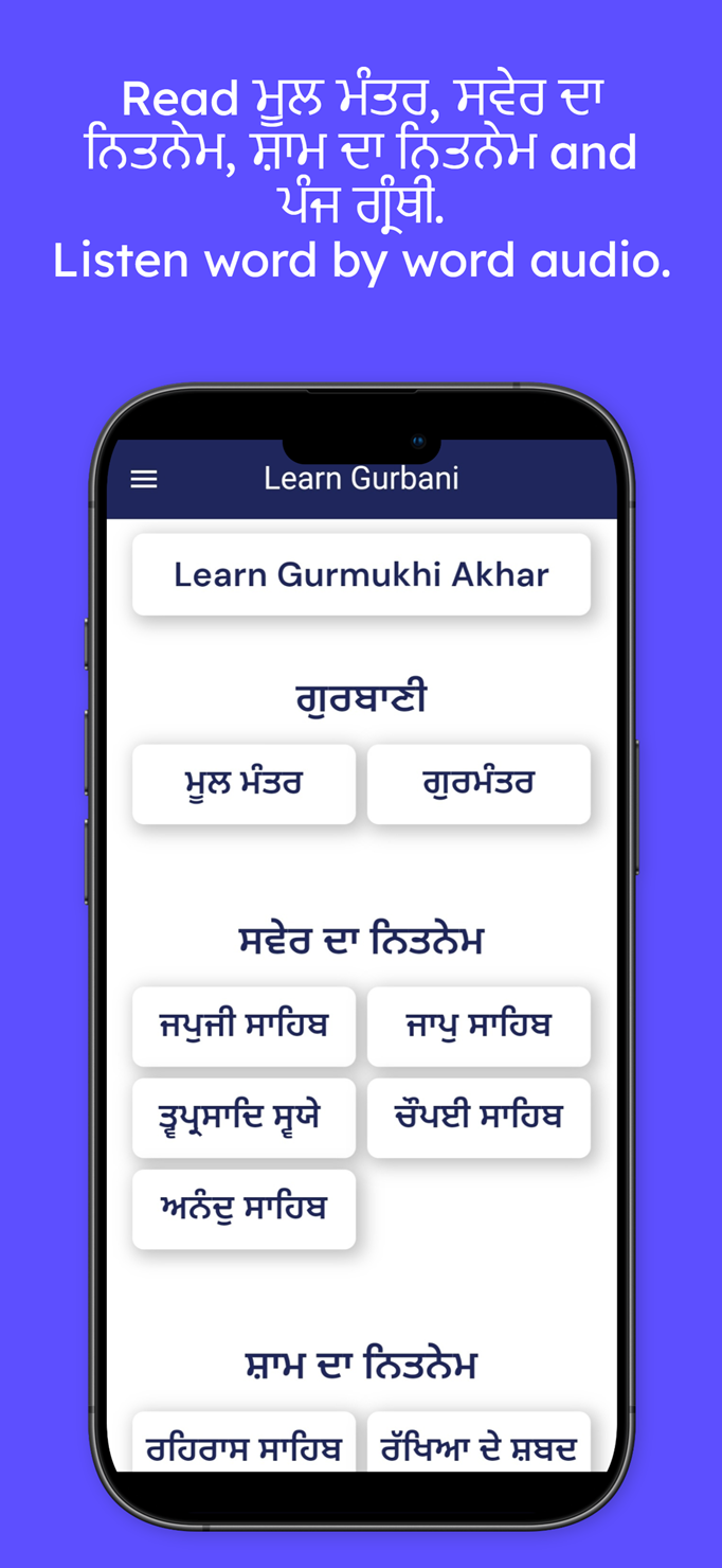 Learn Gurbani App helps students recite and understand Gurbani with confidence. As they learn, they also begin to understand Punjabi — the original language of our scriptures. This builds a stronger bond with Sikhi, language, and culture.